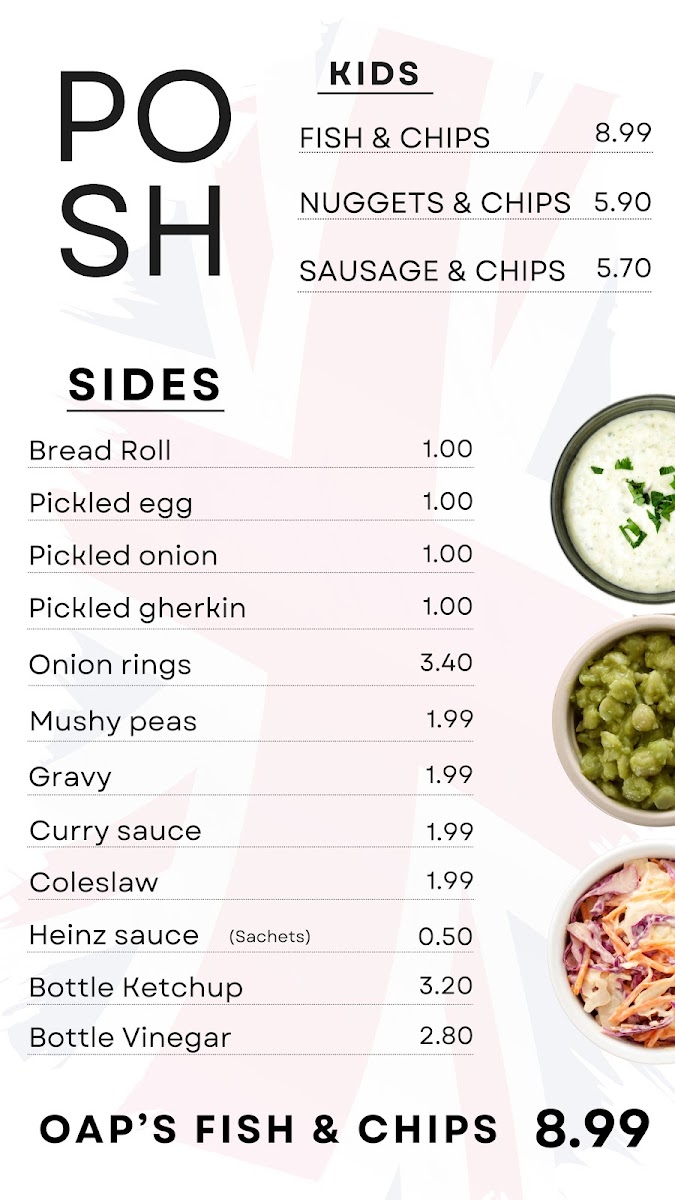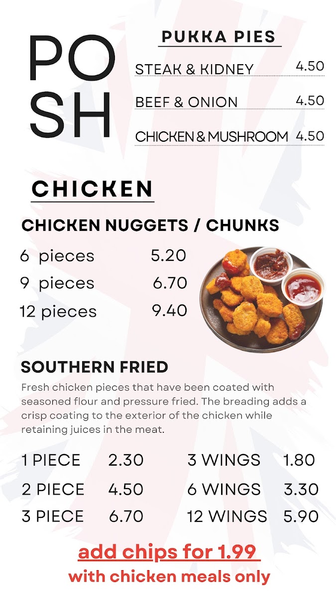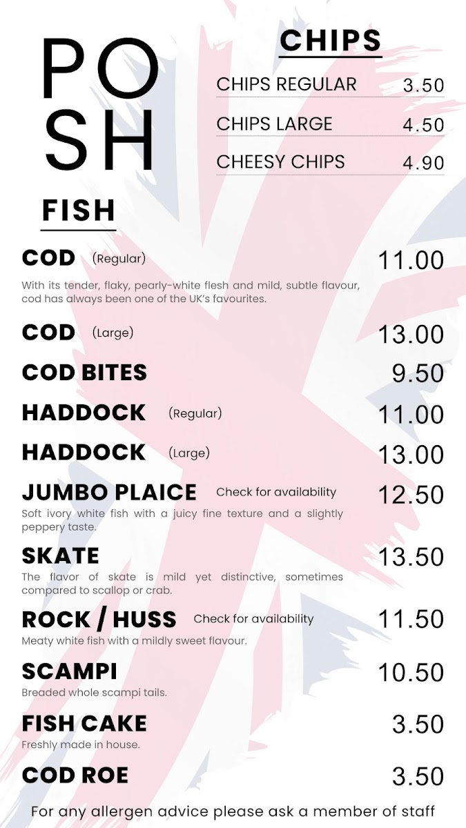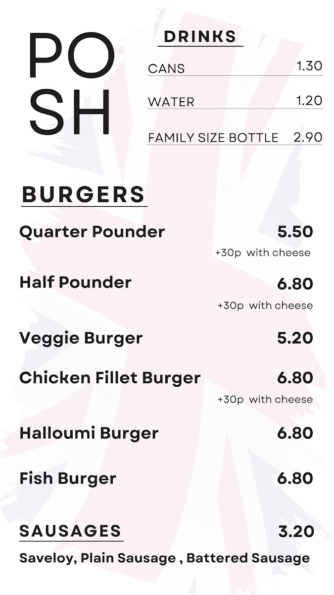 The Posh Plaice offers a diverse and satisfying menu, catering to a wide range of tastes. The Burgers section features options like the Quarter Pounder and Half Pounder for meat lovers, while vegetarians can enjoy the Veggie Burger or Halloumi Burger. For those craving something a little different, the Chicken Fillet Burger is also a great choice. In addition to the burgers, the restaurant serves an array of Fish dishes, including Cod, Haddock, and the popular Jumbo Plaice, as well as other fish varieties like Skate and Lemon Sole. If you're more in the mood for chicken, there are multiple choices such as the 1/4 Chicken, Chicken Nuggets, or 6 Spicy Chicken Wings. For sides, diners can choose from classic options like a Bread Roll, Onion Rings, and Pickled Gherkin, or go for something more indulgent with Cheesy Chips. The Savouries section includes a variety of comforting dishes such as the Jumbo Sausage in Batter and Fish Cake, with options like Spam Fritter for something unique. There are also Steak & Kidney, Beef & Onion, and Chicken & Mushroom options for those who want a hearty bite. The drinks menu includes refreshing Cans, Water, and a Family Size Bottle. With a variety of meal options at reasonable prices, The Posh Plaice delivers on both choice and flavor.